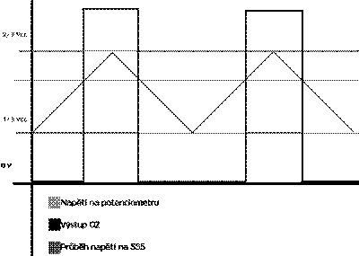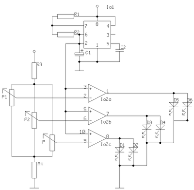 Dál jsou na řadě komparátory, které porovnávají napětí z časovače přivedené na neinvertující vstupy s napětím, které je vytvářeno jedním ze tří potenciometrů rovněž v rozsahu 1/3 až 2/3 napájecího napětí. Potenciometry společně s odpory R3 a R4 rozdělují napájecí napětí na třetiny. V okamžiku, kdy napětí na neinvertujícím vstupu překročí napětí na invertujícím, komparátor se dostane do saturace a na výstupu se objeví kladné napětí; v tomto stavu setrvá tak dlouho, dokud napětí na neinvertujícím vstupu neklesne pod úroveň nastavenou příslušným potenciometrem Otáčením potenciometru se mění šířka pulsu - tedy doba, po jakou svítí led dioda. Vše se děje velmi rychle a lidské oko vnímá různou délku pulsu jako různý jas.