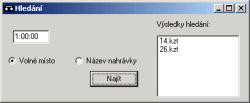 Primitivní vyhledávání, lze vyhledávat buď podle volného místa, nebo podle názvu nahrávky. Ve výpisu se objeví kazety, jež odpovídají kritériím vyhledávání. Kliknutím na ně zobrazíte v hlavním okně